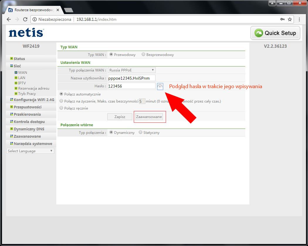 Wpisując hasło mamy możliwość jego podglądu, aby móc się upewnić czy jest poprawnie wpisany, aby to zrobić klikamy lewym klawiszem myszy na ikonę górnego łuku z kropką pod spodem. Gdy już wszystko sprawdziliśmy , zaznaczamy "Połącz automatycznie" i przechodzimy do zakładki poniżej "Zaawansowane".