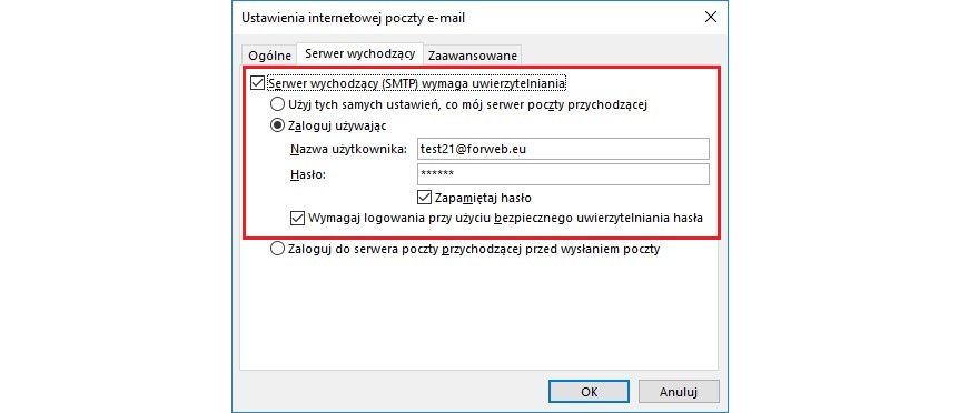 W następnym kroku wybieramy zakładkę "Serwer wychodzący" i zaznaczamy "Serwer wychodzący SMTP wymaga uwierzytelnienia" oraz zaznaczamy "Zaloguj się używając..."" i podajemy dane do logowania się do skrzynki pocztowej. Zaznaczamy również opcję Wymagaj logowania przy użyciu bezpiecznego uwierzytelniania hasła